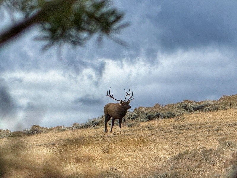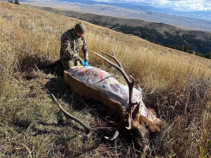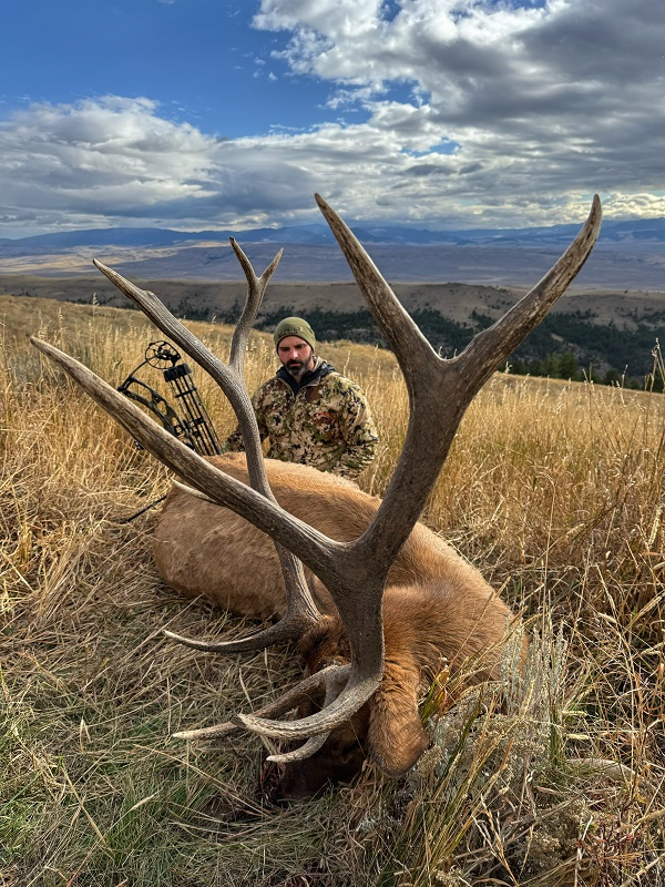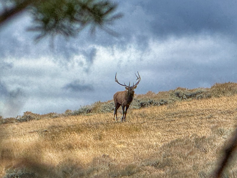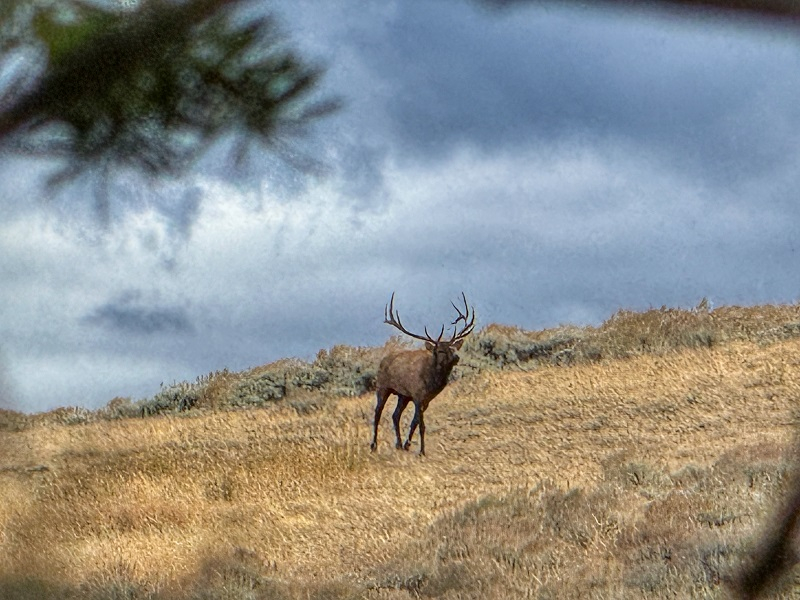 The other bowhunter got his money's worth after we hiked the first few days trying to get some open Country bulls to cooperate. The bugling and action was intense and we had a few really close calls. The one bull walking towards us in the pictures was broadside for a few minutes and once we stalked into range the hunter was full draw on him and before he could get a shot off it turned and walked over the hill. The 4th morning we finally capitalized on a pattern we've been seeing the first 3 days and went for it. After getting into our spot real early in the AM some super strong winds prevented any chance on taking a shot in the open terrain. That was also accompanied by some spitting rain. Lots of bugling but most of the elk stayed out at 250+ yards just under a hilltop appearing to stay just out of the worst of the wind. That didn't help us but finally one bull broke from the herd and come to the wallow we where watching at our location. The problem is there is no cover to sit over the wallow except a small pine tree 60-65 yards below it. So once we saw his antler tips coming over the hill it was full game on as he disappeared into the hole. As he started to step out luckily he come towards us to peer over the hill and offered a shot at 62 yards as I stopped him with a cow call broadside for the shot. The hunter drew his bow and was trying to settle the pin in the wind which was a little lighter than earlier in the morning. Before the hunter could release a arrow the bull bugled 3 times skylined on the hill at 62 yards, it was a sight neither of us will ever forget. The bull then turned into us and I heard the hunter say shit. A few monents later he turned quartering to us slightly as if to turn back over the hill so I stopped him again with another cow call and told the hunter 60 yards as I ranged him again. This time the hunter settled the pin and buried the arrow behind the shoulder. The bull took off and I told him you got him. The arrow I saw was a good hit and the bull ran 124 yards and laid down and died on the hill in front of us. It was a awesome experience!