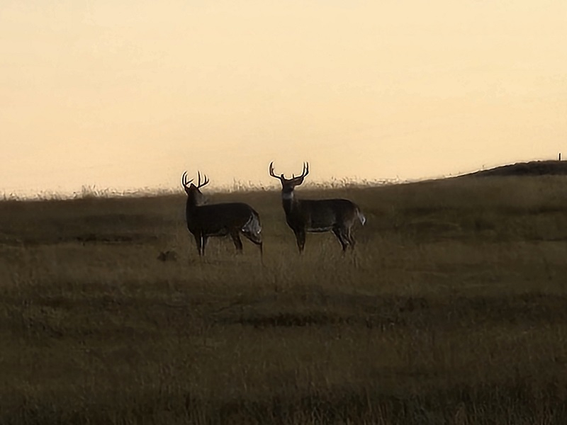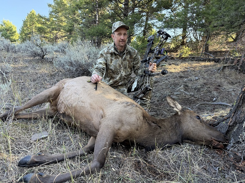Meanwhile, the hunter in the natural blind was into elk before we even got 200 yards from him. He had 2-3 bigger bulls come up by him, some cows, and one of the biggest bulls was standing at 61 yards but the natural blind is on a hillside and not level to take a comfortable standing shot at that range. So the next cow elk that come by he shot and she piled up 20 yards later.